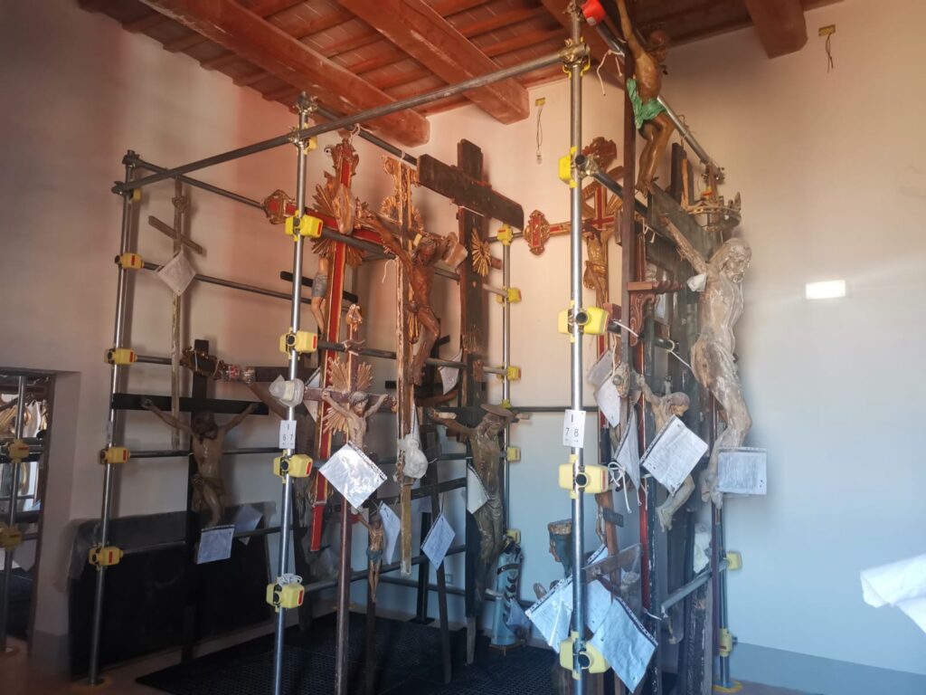 Il deposito, il Museo invisibile, custodisce un tesoro composto da migliaia di opere d’arte, quelle ricoverate dopo i crolli del sisma del 2016. Ci sono pale d’altare, statue in marmo, in legno, in terracotta, crocifissi, paramenti liturgici, tessuti, arredi sacri, oggetti da cerimonia, colonne, campane, porzioni di affreschi, frammenti di chiese che poco o niente hanno potuto contro la violenza delle scosse che hanno colpito queste terre tra l’estate e l’autunno del 2016.