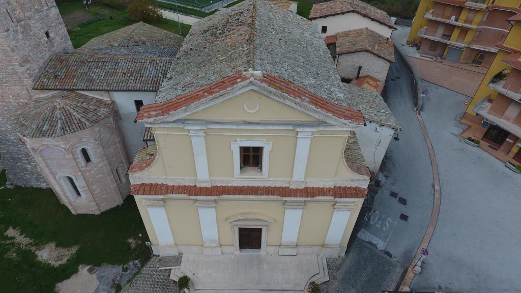 La pieve domina tuttora il centro del paese, con la doppia mole della chiesa gotica, su due piani e con abside poligonale, e di quella ricostruita accanto nel Settecento con orientamento invertito per assecondare il nuovo sviluppo urbanistico. Le prime tracce pittoriche risalgono a Cola di Pietro, camerinese di fine Trecento, ma le presenze più consistenti, in questa chiesa e nel resto del territorio,