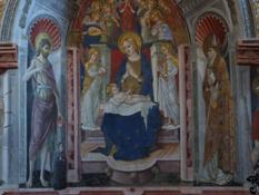 Il comune di Sarnano sorse nel Duecento su una collina dall’unione tra alcuni villaggi dei dintorni, affrancatisi dai signori feudali di Brunforte. Il luogo sarebbe stato visitato da San Francesco, cui una tradizione attribuisce l’invenzione dello stemma comunale raffigurante un serafino. Certo è che vi abbondano le antiche memorie dei frati minori, dal convento di Roccabruna alla grotta di Soffiano. La chiesa principale, Santa Maria di Piazza Alta, nacque dipendente dall’abbazia benedettina di Piobbico e in specie nel Quattrocento si arricchì di opere dei migliori pittori marchigiani.